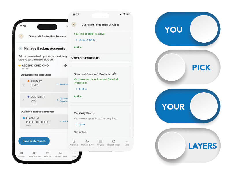 At Altura Credit Union, we want to give you the tools to layer your overdraft protection your way. With Overdraft Protection Services in Online and Mobile Banking, you can decide how you want to protect your account from going negative by selecting and prioritizing the options that fit your needs. Link your Savings, Credit Card, or Overdraft Line of Credit to keep your account positive, before relying on emergency Courtesy Pay services.